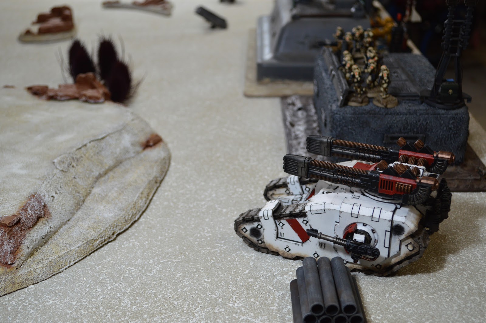 Sergeant Albrecht and Squad Ritter take their rhino over the hill and around the flank of the White Scars Sicaran, attempting to catch the tank in a pincer between them and the dreadnought. |