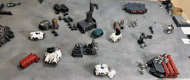 What should I have done differently? Maybe I should have been more aggressive with the Land Raider early, but I knew it would not survive long against a magna melta and two gravis lascannons. But losing my transport in my own deployment zone left my slow units far out of position compared to if they had been stranded in a more forward position where they could have threatened the World Eaters. On target selection, maybe I should have ignored the Deredeo but my heavy support squad was one of the only things I had that could threaten it from a distance. I was probably doomed to lose that firefight no matter what, but luck seemed to be against me as well. My lascannons somehow failed to cause a single wound and I lost the entire squad in return. Against Pete, he managed to roll an Explodes! on my Land Raider with a snap shot from his Stunned Land Raider! Of course, I also missed a very makeable charge with my Praetor against the Melta Predator that was tormenting him from a distance. Of course, the same Predator then subsequently killed him on Pete's next turn, giving Pete an insurmountable lead in VPs.
