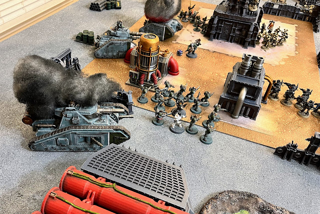 Tactically, the plan to go first and claim the objective was sound because once my militia infantry unit was in the Bastion, it was going to be very difficult for Pete to ever remove them. I made some mistakes with the cavalry (bikers) by shooting at the fire team and enabling Pete to use the Return Fire reaction to do far more damage to me than I did to him. By the time they charged and took Overwatch, they did not have enough numbers to even tie up the fire teams in melee. Keeping the Sentinels behind cover to hold the flank against Pete's tanks worked better than expected. I erred in my positioning of the Earthshaker, leaving it exposed to Pete's shooting along the flank, when I could have hidden it almost completely behind the artillery bunker terrain piece. Finally, sacrificing a grenadier squad to destroy a Leman Russ with krak grenades, while also drawing the Ogryns out into the open, was a good trade. It was made possible by the covering fire of the Rapiers keeping Pete's infantry from screening his tanks and the tanks' guns being nerfed so much that they could not wipe out my squads in a single shot like they could in the old edition.
